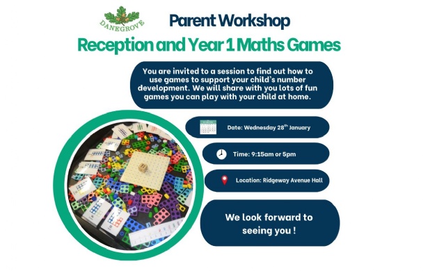 Parent Workshop - Reception and Year 1 Maths Games. Wednesday 28th January - Ridgeway Ave at 9:15am or 5pm